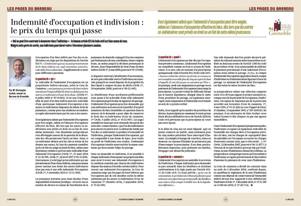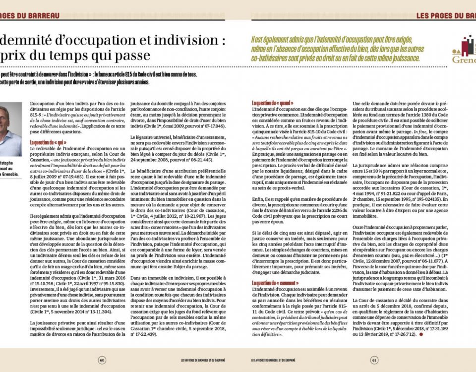 Dernier article de Maitre Lachat dans les Affiches de Grenoble et du Dauphiné: Indemnité d'occupation et indivision : le prix du temps qui passe Lire la […]
